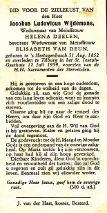 Jacobus Ludovicus Wijdemans Man geboren op 31 augustus 1852 in ‘s-Hertogenbosch overleden op 12 juli 1939 in het St. Josephsgesticht te Tilburg Ouders: Antonius Josephus Wijdemans 13-03-1818 - 31-10-1877 Geertrui van den Eng 26-06-1833 - 23-08-1858 Partner: Maria Elisabeth van Deun geboren 26 december 1850 overleden 29 januari 1881 Kinderen: Leonardus Josephus Wijdemans Gordina Johanna Wijdemans 2e Partner: Helena Deelen geboren 19 mei 1854 overleden 30 december 1911 Kinderen: Maria Godefrida Wijdemans Elisabeth Francisca Wijdemans